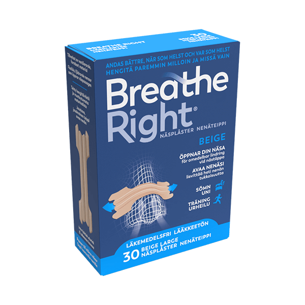 Joustavat ja jousimaiset Breathe Right® nenäteipit nostavat ja avaavat nenää hellävaraisesti ja parantavat ilmavirtausta ja auttavat hengittämään helpommin. Breathe Right® lievittää välittömästi nenän tukkoisuutta, joka voi johtua vilustumisesta, allergioista tai väliseinän vinoudesta.